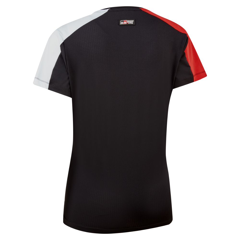 A super soft Cool Dry women's short sleeve t-shirt with subtle ventilation to the upper and lower back to keep you dry and refreshed throughout the day. This black soft touch t-shirt features a unique shoulder block design and features a branded neck tape and TOYOTA GAZOO Racing logo printed to the front with a rubber TGR badge to the upper back neckline.